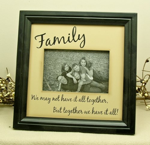 This wooden frame would be the perfect way to display your favorite photos. The frame has a wooden, neutral tan matte with antiqued edges and finished with black molding. The opening fits a 4'x6" photo. This frame can either hang or stand making it very versatile.
