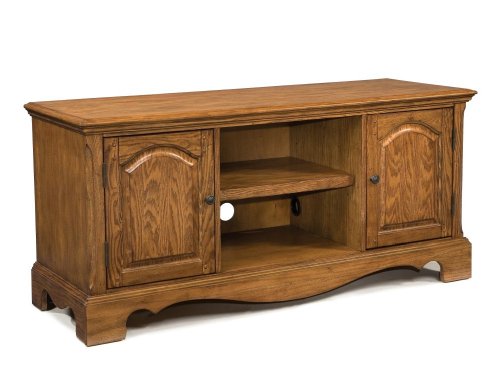 This furniture arrives unassembled. 88-5538-09 Features: Constructed of Ash hardwood solids with Oak veneers in a rich multi step Oak finish Antique Brass finished hardware Perfect for flat screen TV's up to 42" Two cabinets, one on each side feature raised wood detail and antique brass finished hardware on doors Adjustable shelf inside Open center storage compartment has adjustable shelf and wire management openings Features warm country style with comfortable, functional design Easy to assemble Finish: Oak Dimensions: 44"(W) x 18"(D) x 26"(H)
