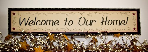 This wooden plaque with softly carved edges will be the perfect way to welcome guests into your home. The neutral tan background has antiqued edges and black border. Softly painted grapevine with berries and star accents frame the saying, "Welcome to Our Home! This would also be a lovely gift for family or friends.